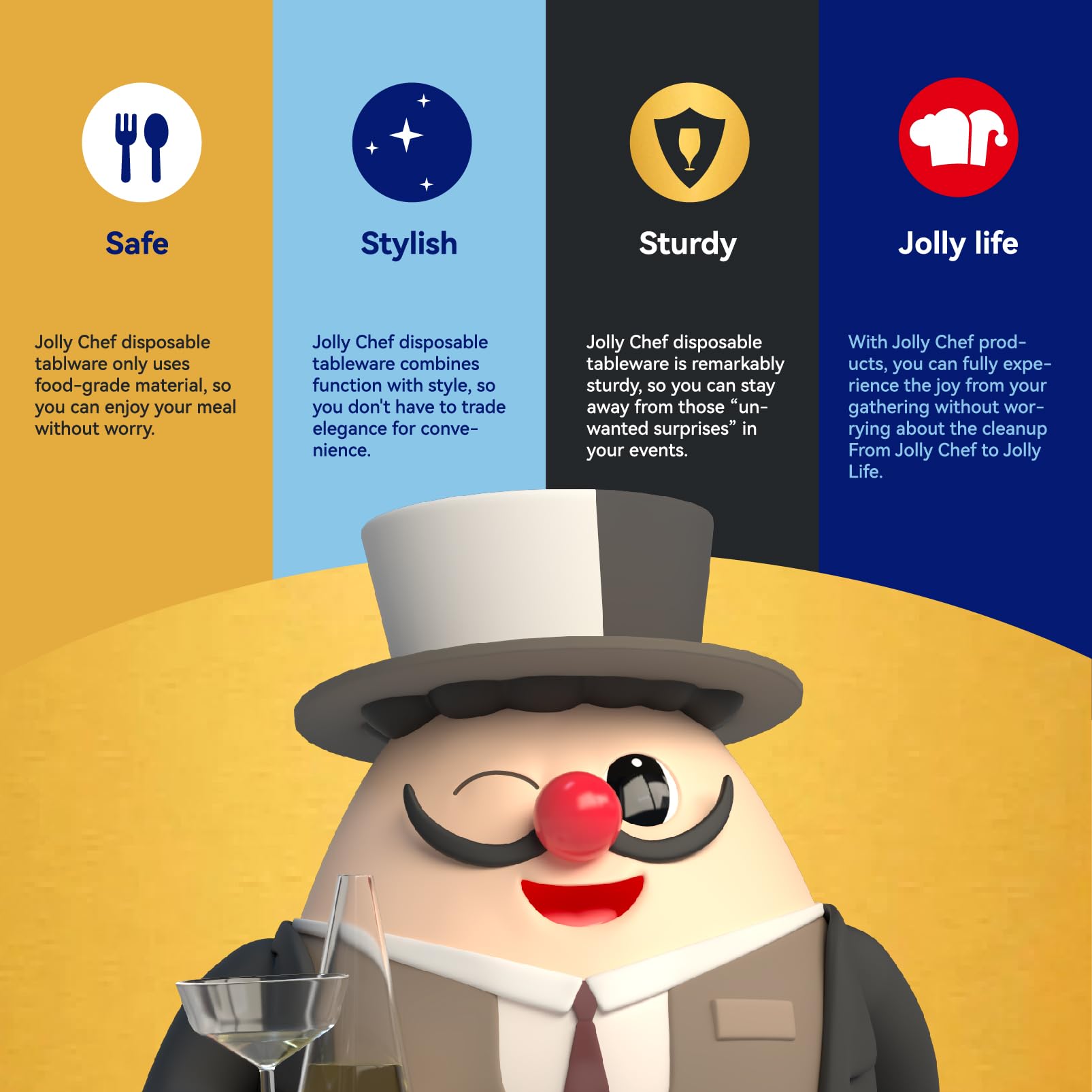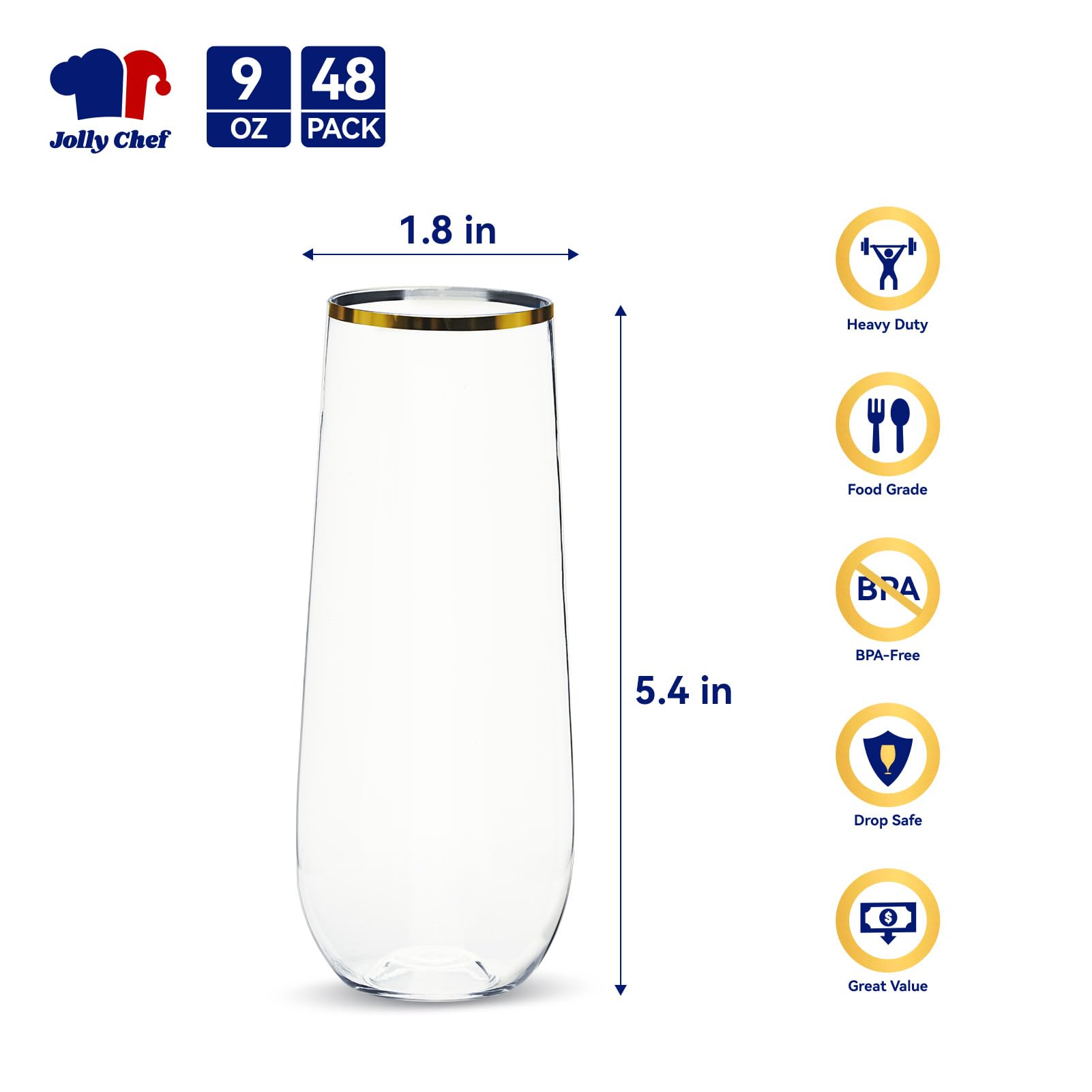 JOLLY CHEF 48 Pack Plastic Champagne Flutes, 9 oz Clear Stemless Champagne Flutes, Plastic Champagne Glasses with Golden Rim, Shatterproof Recyclable Mimosa Glasses for Party Wedding Birthday