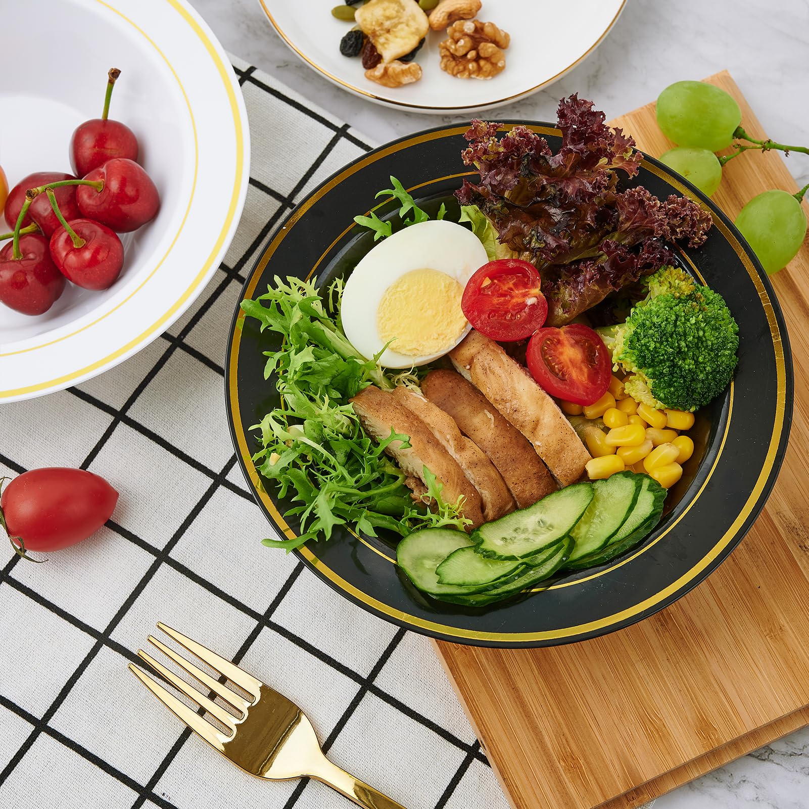 • 【ELEGANT DESIGN】 Grid gold rimmed bowls in black color like china bowl, which has an elegant and exquisite appearance, Classical combination of the sparkling gold rim on a plain black background brings a touch of grace and elegance to your posh party set up