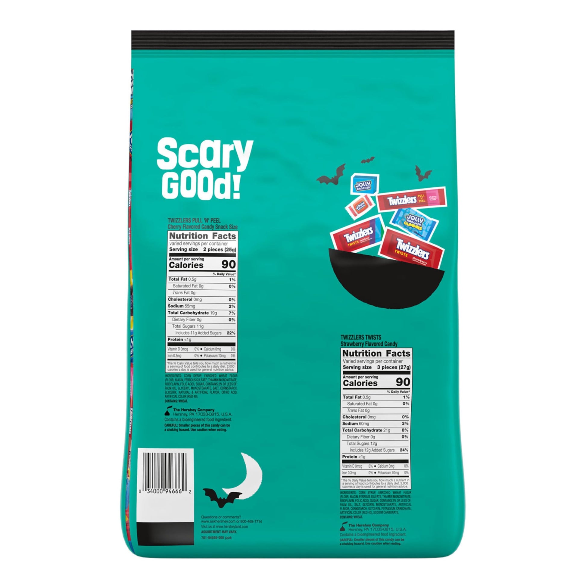 Details: Enjoy a delicious fruit flavored treat anywhere and anytime with this fruity assortment of Halloween candy. Offering six crowd pleasing favorites, this trick or treat candy assortment is perfect for sharing with family, friends, teammates and co-workers. Take this bulk variety candy bag into the office break room, pour some individually wrapped candies into your candy jar at home or take a bag to your next sports game to celebrate the win. This variety bag of assorted fruit flavored candy includes TWIZZLERS PULL 'N' PEEL cherry flavored chewy candy, TWIZZLERS Twists strawberry flavored chewy candy, TWIZZLERS Twists Rainbow chewy candy, JOLLY RANCHER gummies candy, JOLLY RANCHER hard candy and JOLLY RANCHER Chews candy.