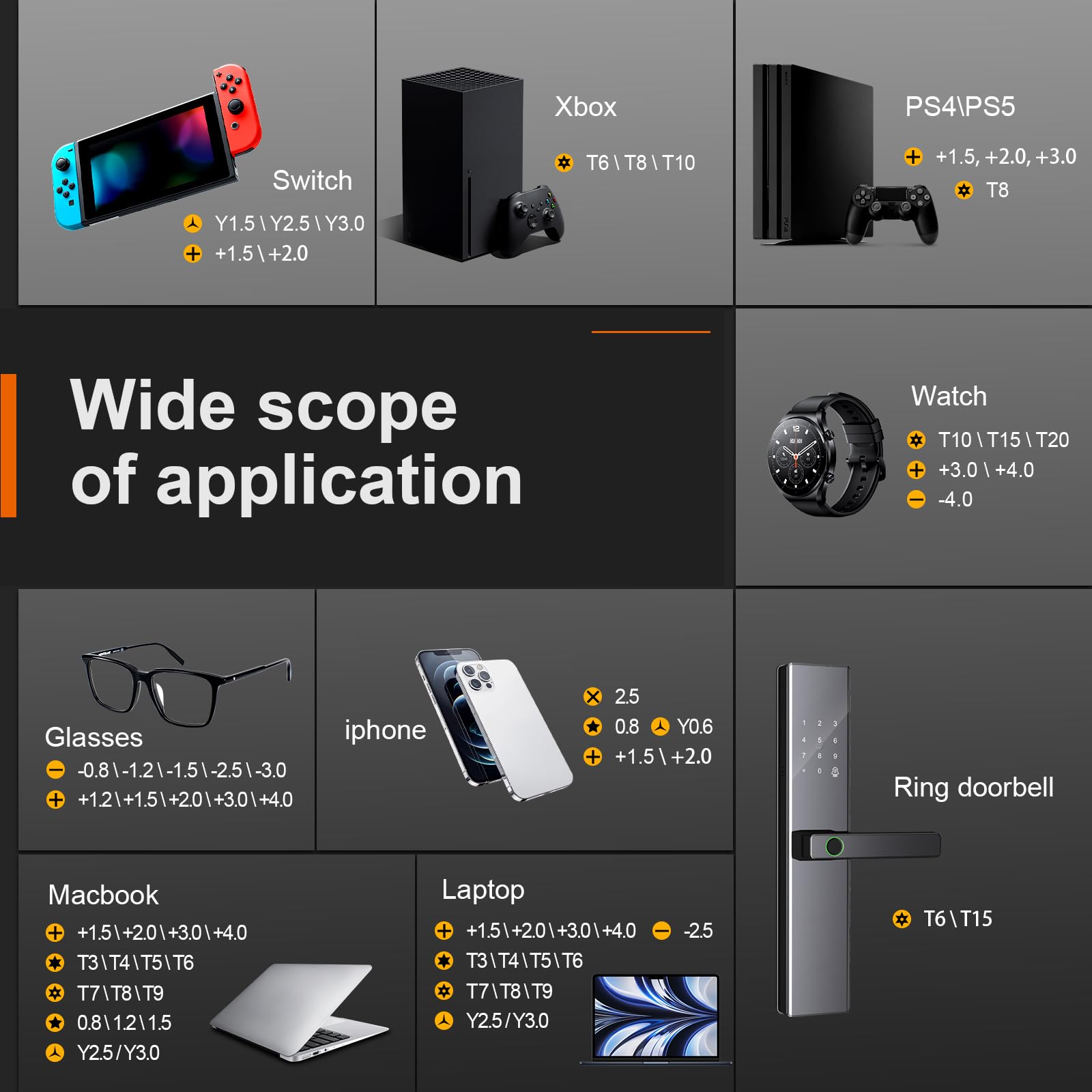 • 【Wide scope of application】-- T8 +1.5/2.0/3.0 are used for PS3/PS4/PS5 controllers and consoles. T6/8/10 are used for Xbox 360/Xbox One/Xbox Series controllers and consoles. Y1.5/2.5/3.0 +1.5/2.0 are used for Switch/NS-Lite/Joy-Con/Wii/Game Boy Advance. T3/8 are used for Fitbit wristband/folding knife. +1.2/1.5/2.0/3.0/4.0 T3/4/5/6/7/8/9 Y2.5/3.0 -2.5 are used for Microsoft/Acer/Dell and other laptops. +1.2/1.5/2.0/3.0/4.0 -0.8/1.2/1.5/2.5/3.0 are used for Desktop Computer/Watch/Glasses/Toy.