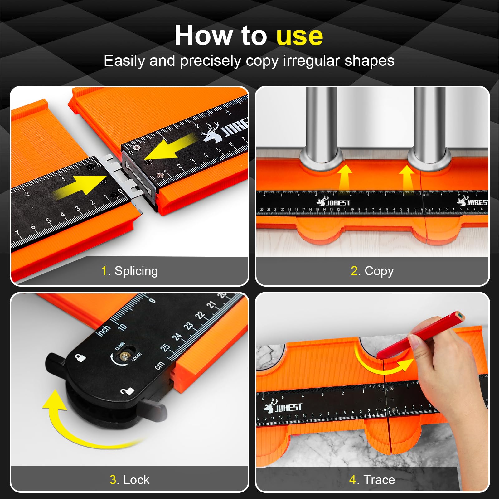• 【Multi Purpose】Being used with other tools such as pallet buster, crowbar, bradawl, carpentry tools, marking tools, leveler tool, oscillating tool, caulking tool, floor/baseboard cutter and so on. Be it vinyl tiles laying, tiling, hardwood/lvp/laminate flooring, carpet cutting, wallpapering, wall panelling, home improvement, wood working, winding pipes, moulding, welding, DIY, the JOREST contour gauge comes in handy while profiling work.