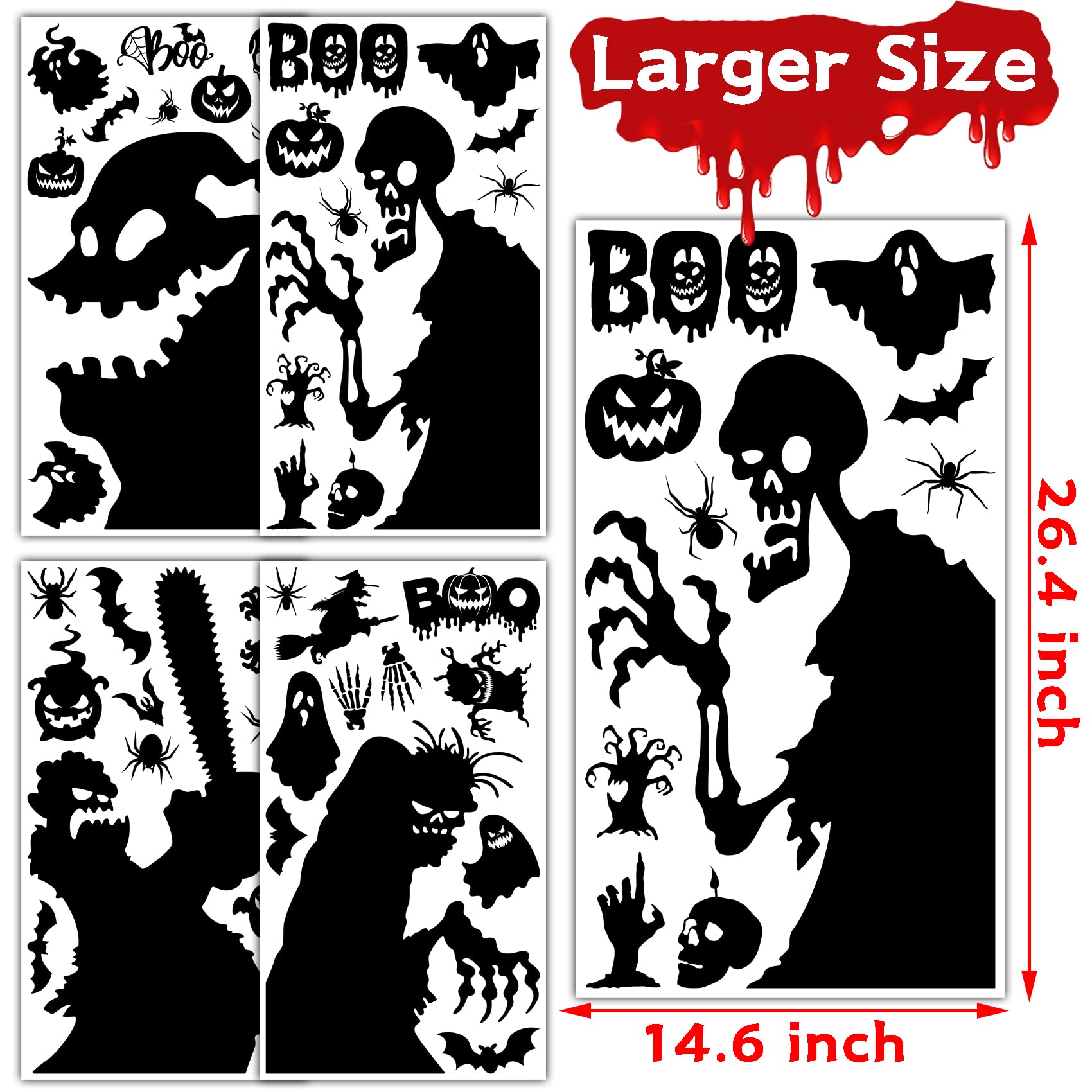 • LARGE HALLOWEEN SILHOUETTE: Our Halloween window sticker sheet is 14.6×26.4 inches, You will get 4 sheets in total, Each sheet of Halloween window clings has a large monster or zombie window decal with various small window stickers, Large window clings are suitable for your porch and windows