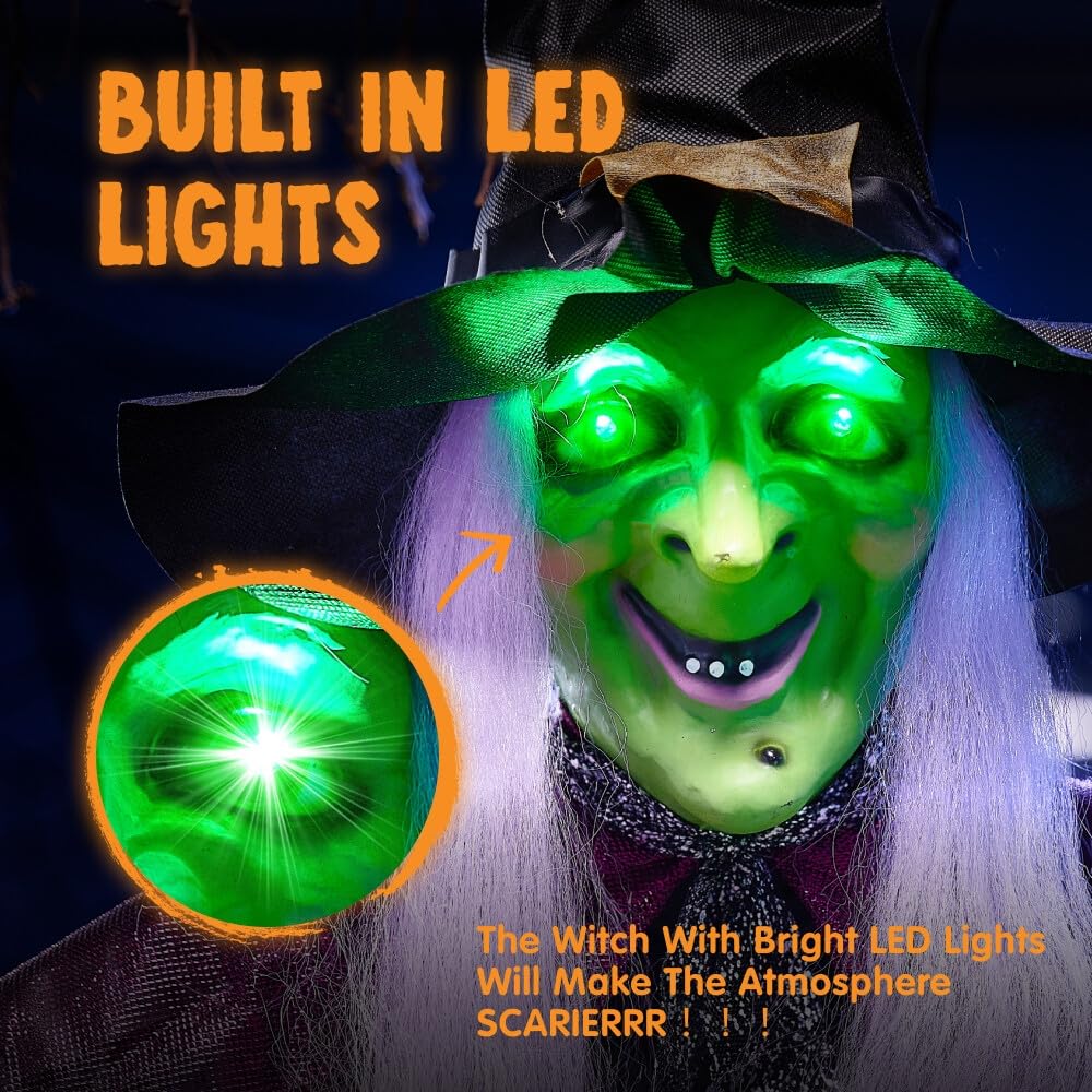 • CREEPY DECOR. Our package comes with 1 pack of hanging witch decorations. 78 inch height, This features an eyes that light up, blinking green eyes, scary witch sound effect, and its right hand holds a magic ball. Very specific Halloween theme outdoor decoration.