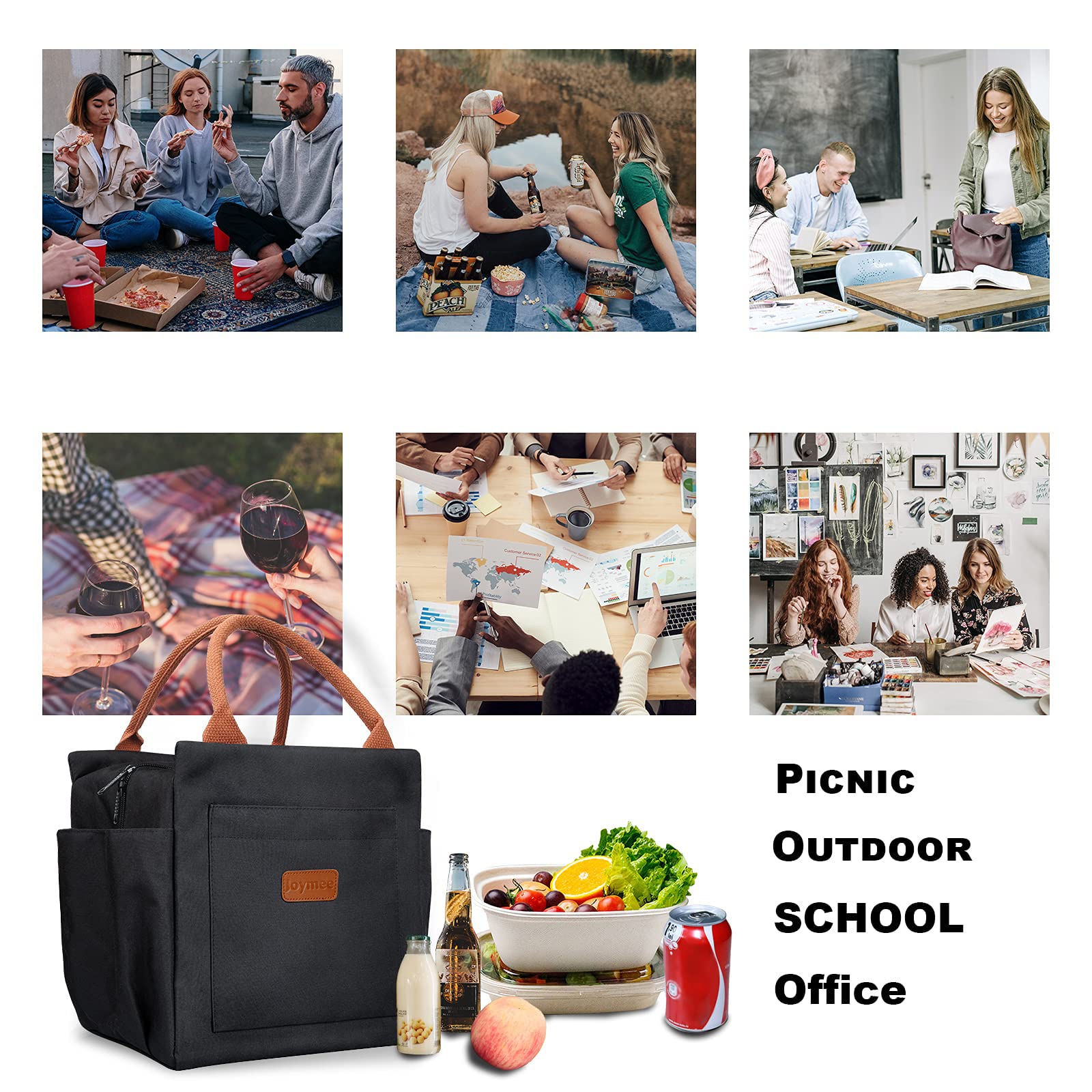 Joymee Lunch Bag Women Insulated Lunch Box Reusable Leakproof Large Spacious Cooler Tote for Women Men Adult with Bottle Holder and Side Pockets for Work Office Travel Picnic - Black