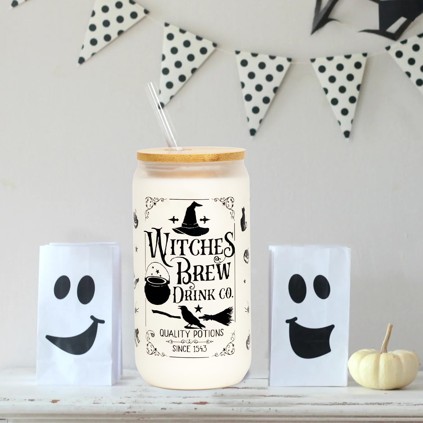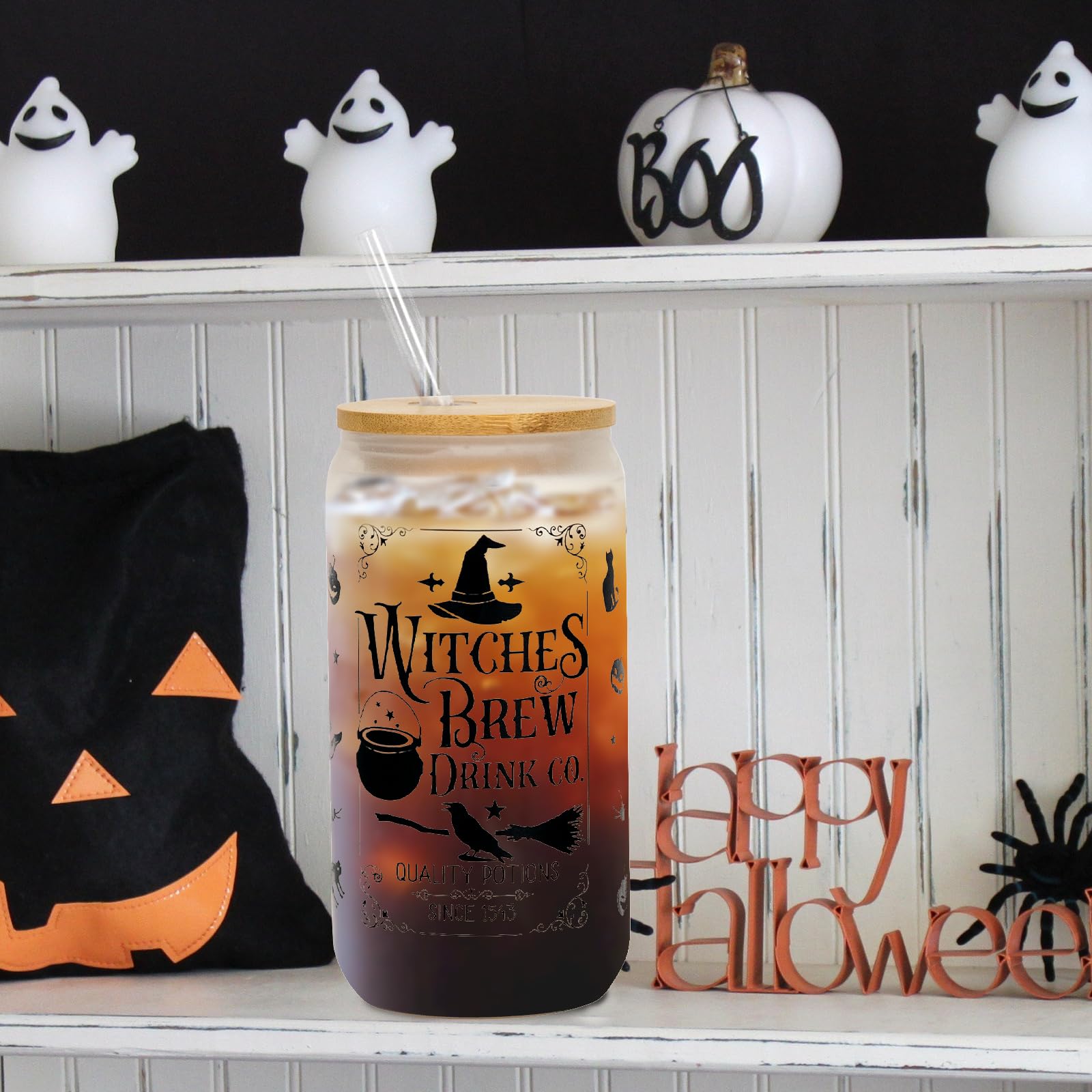 Joyseller Halloween Glass Cup, 18oz Frosted Witch Iced Coffee Can Cup Tumbler with Lid and Straw, Witch Tumbler Beer Can Glass, Halloween Gifts Decorations