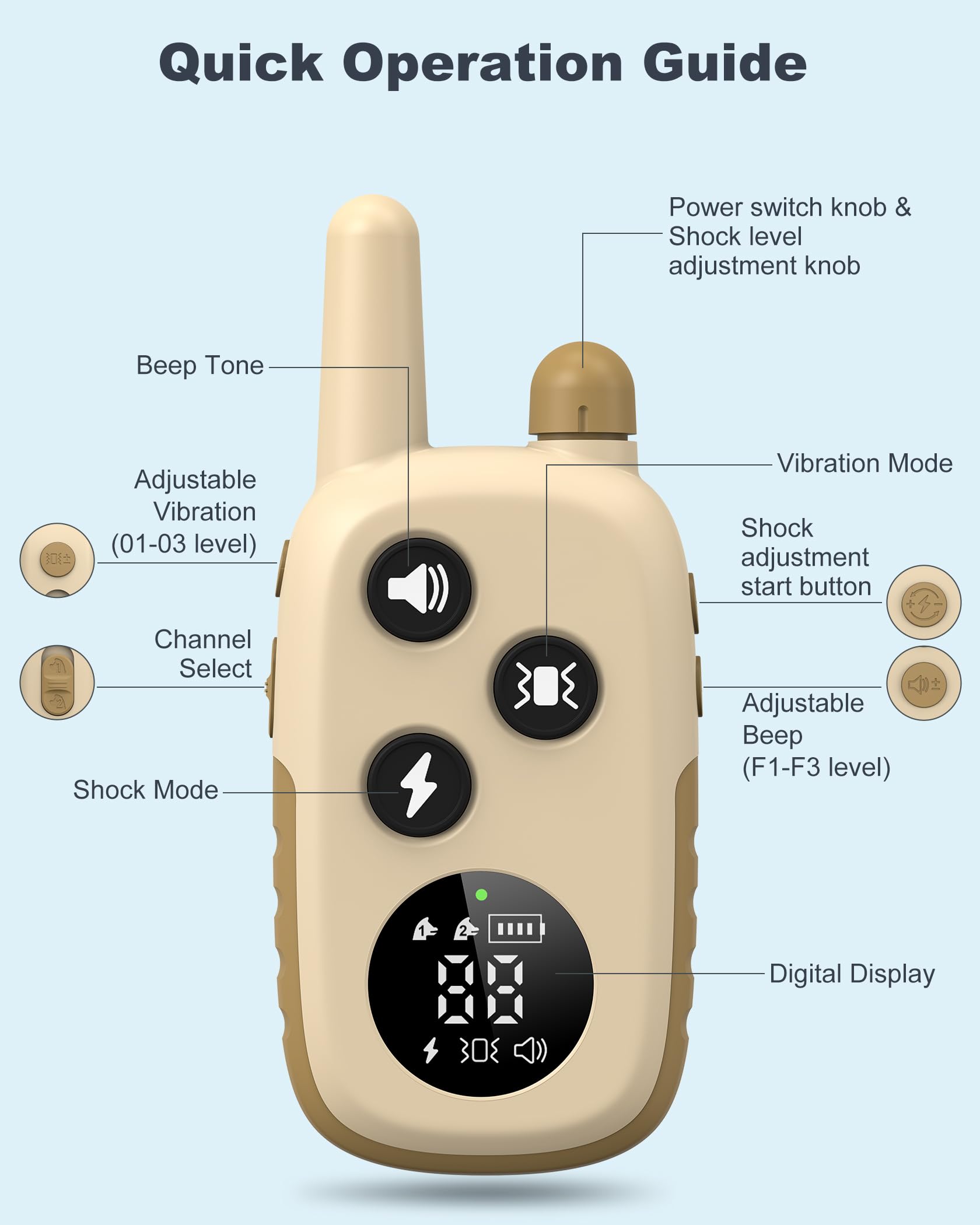 • [Effective Training Mode]: Utilizing advanced 3 safe technology: Beep(1-3 levels), Vibrate(1-3 levels), Static(0-99 levels), our dog shock collar can perfectly control your dog's excessive jumping and other impulse behaviors. Say goodbye to bad habits and hello to a well-trained dog with our trusted training tool! (Note: Please keep holding the shock button while rotating the knob to adjust the shock level.)