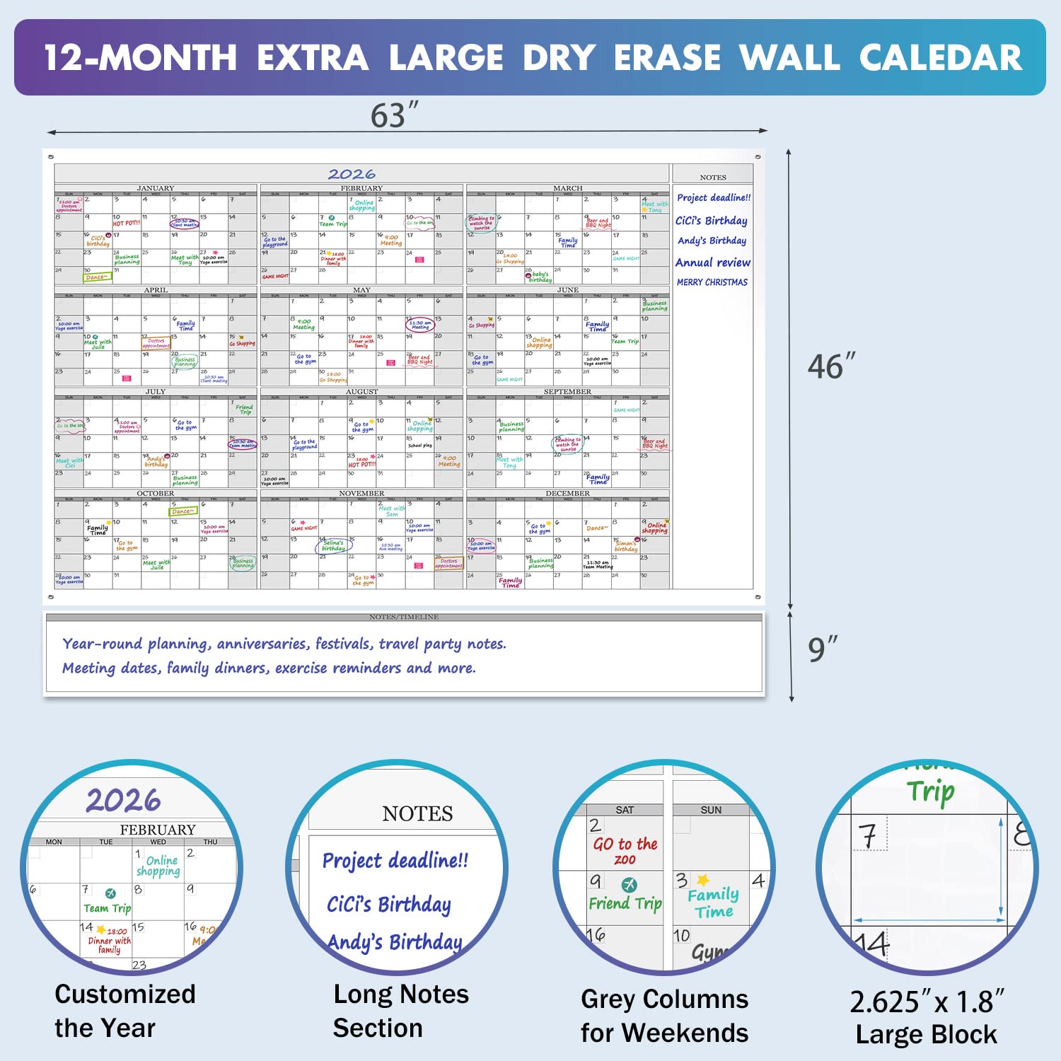 Jumbo Dry Erase Yearly Whiteboard Wall Calendar, 55" x 63", Huge 12 Month Laminated Erasable White Board, Giant Annual Family Schedule Planner, Large Undated Reusable Year Poster