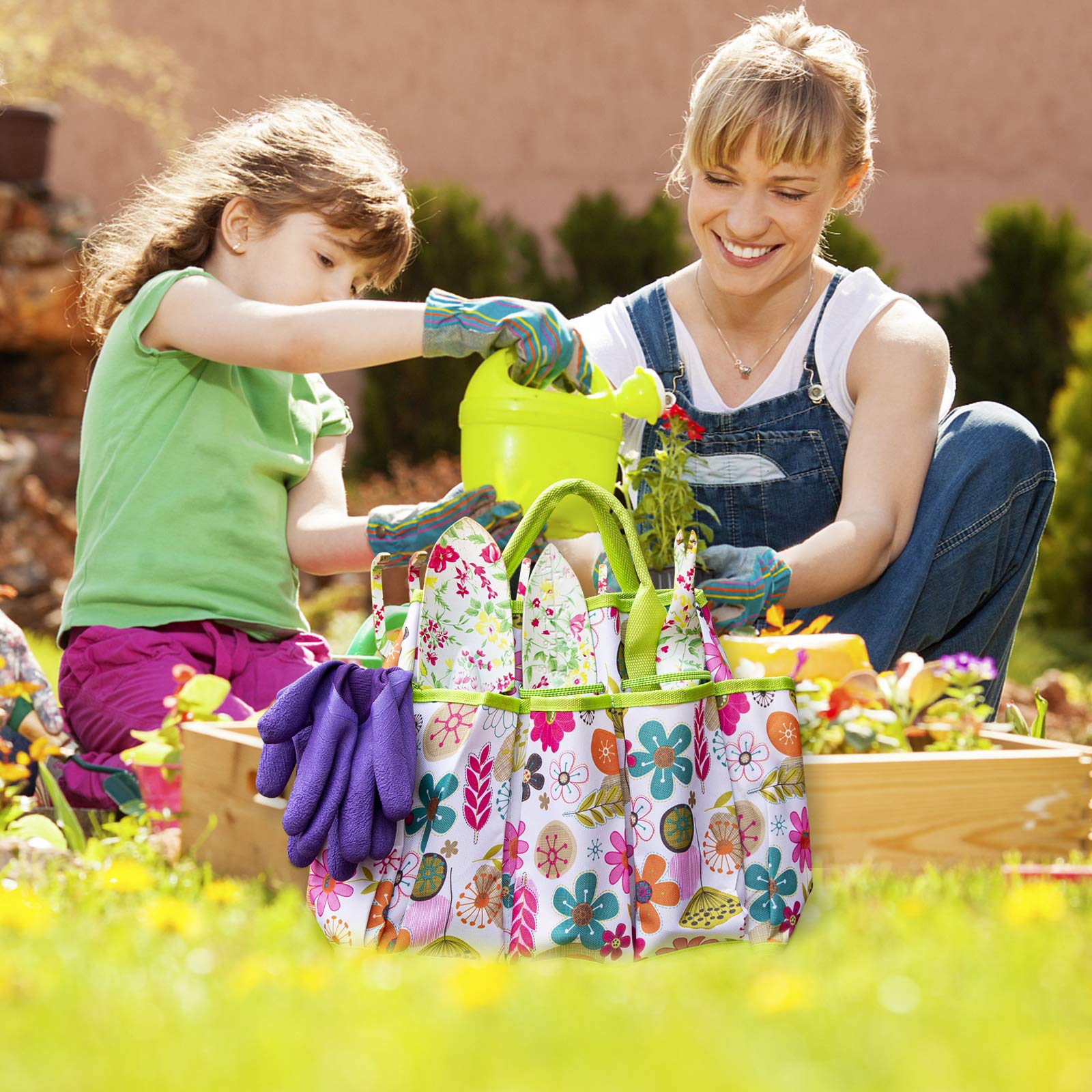 • All-in-one Gardening Kit: 10 piece garden hand tool kit includes trowel, transplanter, hand rake, cultivator, weeder, pruning shears, kneeling pad, garden gloves and cleaning cloth. Also come with a unique floral print tote with multi exterior side pockets to organize different kinds of hand tools and gardening necessities