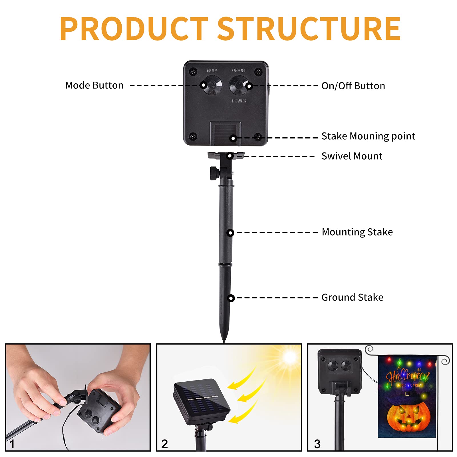 • [UNIQUE DESIGN]: Happy Halloween garden flag is equipped with solar lights and solar panel. The light automatically turns on at dusk, and off to charge during the daytime as long as the solar panel is exposed to the sunlight. (Note: the flagpole not included.)
