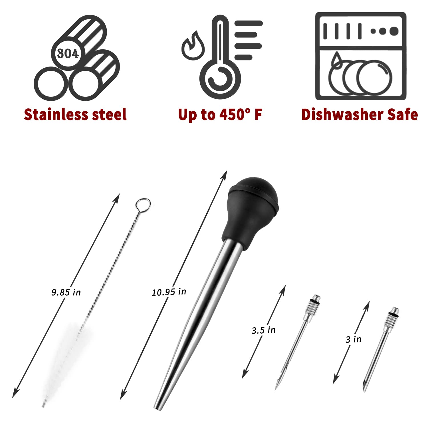 • BASTERS FOR COOKING - Our turkey baster set includes 1 pcs stainless steel turkey baster, 2 pcs baster syringe needles and 1 pcs cleaning brush,used for cooking and BBQ. Prior to baking or grilling, attach the needle included to inject and infuse flavorful juices into your roasts and cuts of meat. You also can remove the excess grease with this food baster.