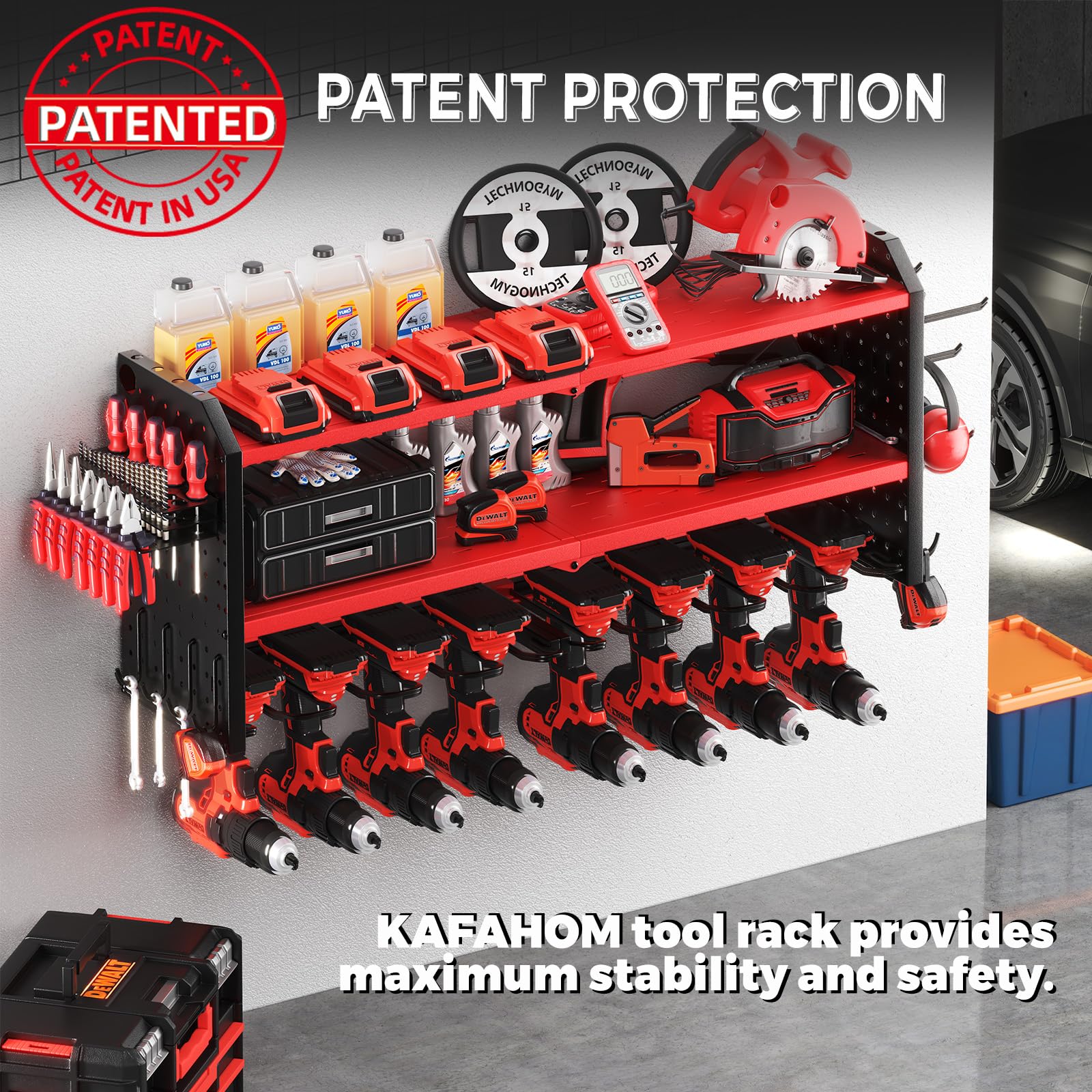 • STRUCTURAL OPTIMIZATION: The KAFAHOM top-of-the-line garage organization rack features a revolutionary structure design that provides exceptional stability and increased weight capacity for your power tools. Thanks to the optimized structural design and aspect ratio - not only is it can perfect for the 16' wall studs, but the utility cordless drill holder can be mounted on concrete, drywall, pegboard. Plus, the lower part can hold up to 8 heavy power tools.