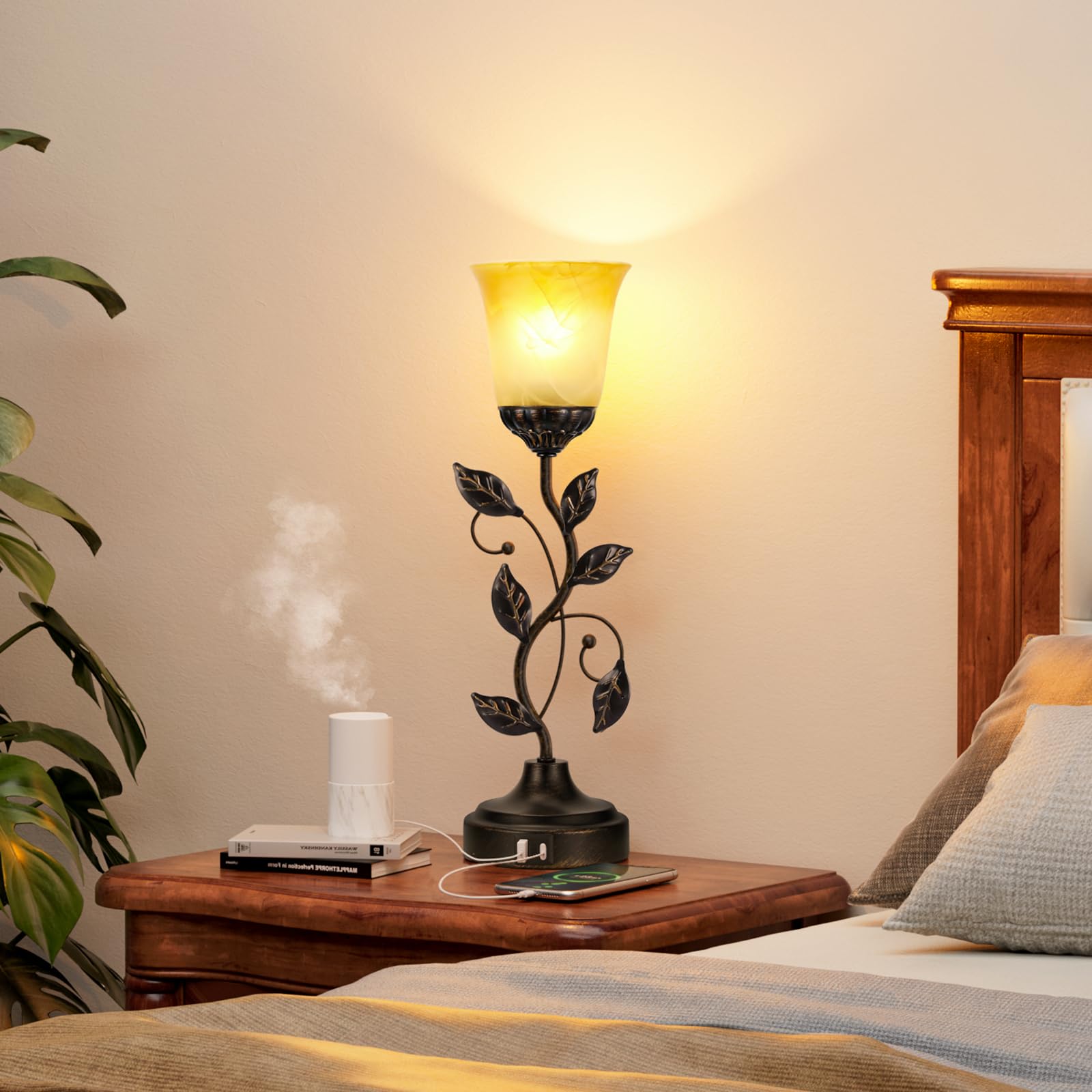 Kakanuo Touch Table Lamp Bedside Lamp Nightst Lamp USB Charging Ports for Living Room 3 Way Dimmable Traditional Leaf Lamp Retro Table Lamp for Bedroom Amber Glass Lampshade LED Bulb Included)