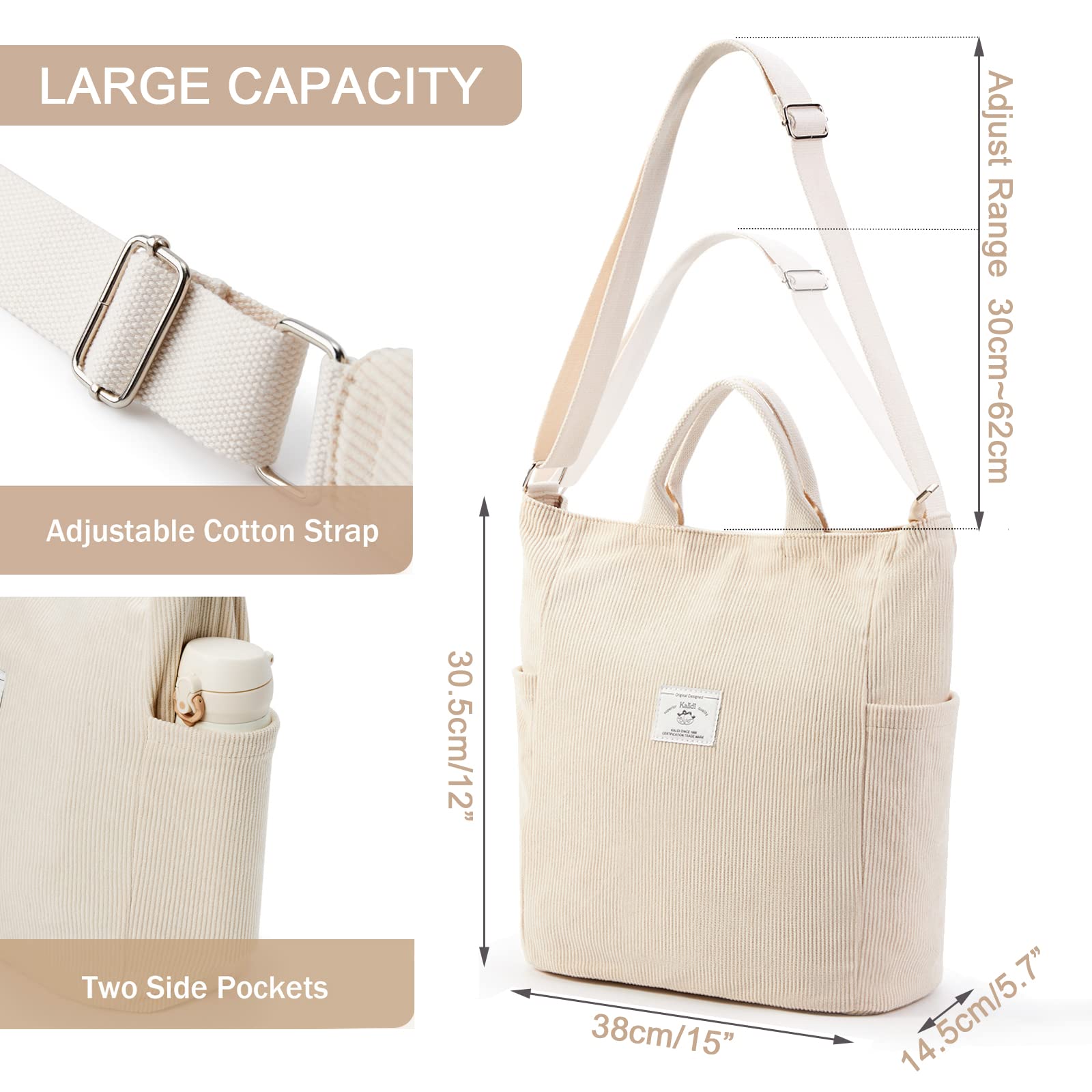 KALIDI Corduroy Tote Bag, Zipper Messenger Bag Shoulder Hobo Crossbody Bag Casual Work Colledge Shopping Women