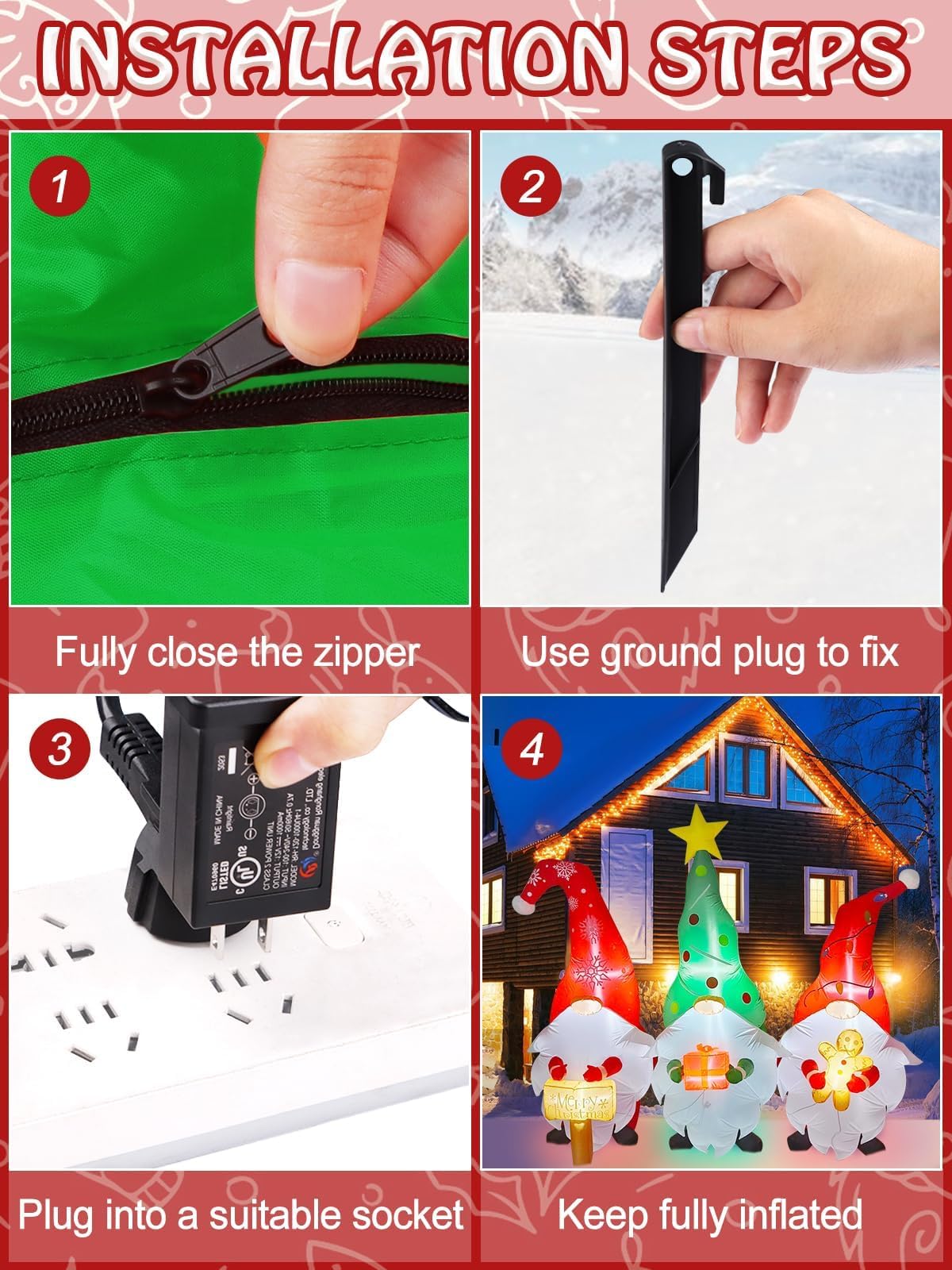 • 【Large Christmas Inflatable Decoration】 3 Christmas gnomes holding Christmas signs, gifts and gingerbread men in their hands, measuring 7.4*2.3* 6.2FT. In addition to the blower, transformer and storage box, it comes with 6 stakes, 2 hooks, 2 ropes, 2 patches and 3 sandbags to secure it to the ground or wall. Don't worry about whether the inflation will be blown away by the wind.